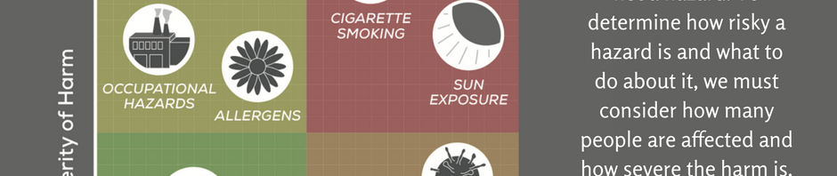 We have a tendency to selectively pay attention to certain hazards. We also tend to consider all hazards we pay attention to as equally risky and all risks as equally harmful. However, hazards can affect different numbers of people (depending on exposure level, genetics, and a variety of other factors) and have very different severity of harm (from temporary skin irritation to death). The simplified graph below provides a general framework for thinking about hazards. Hazards are binary; they either are or are not a hazard. To determine how risky a hazard is and what to do about it, we must consider how many people are affected and how severe the harm is.